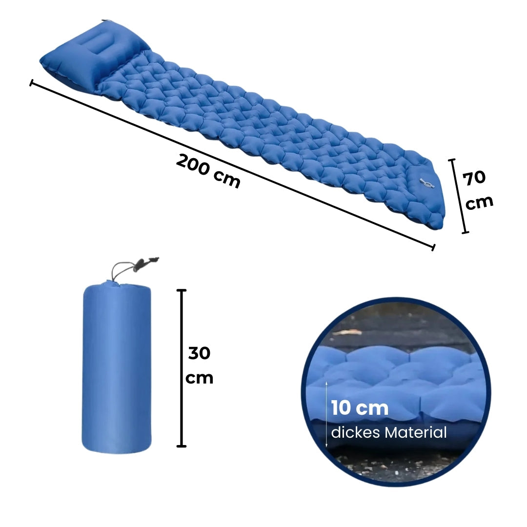 De sjenerøse målene på 200 cm x 70 cm og høykvalitetsmaterialet gir optimal sovekomfort. Uansett om du sover på hardt underlag eller ujevnt terreng, tilpasser den ergonomiske formen til vår isomat seg kroppen og reduserer trykkpunkter.